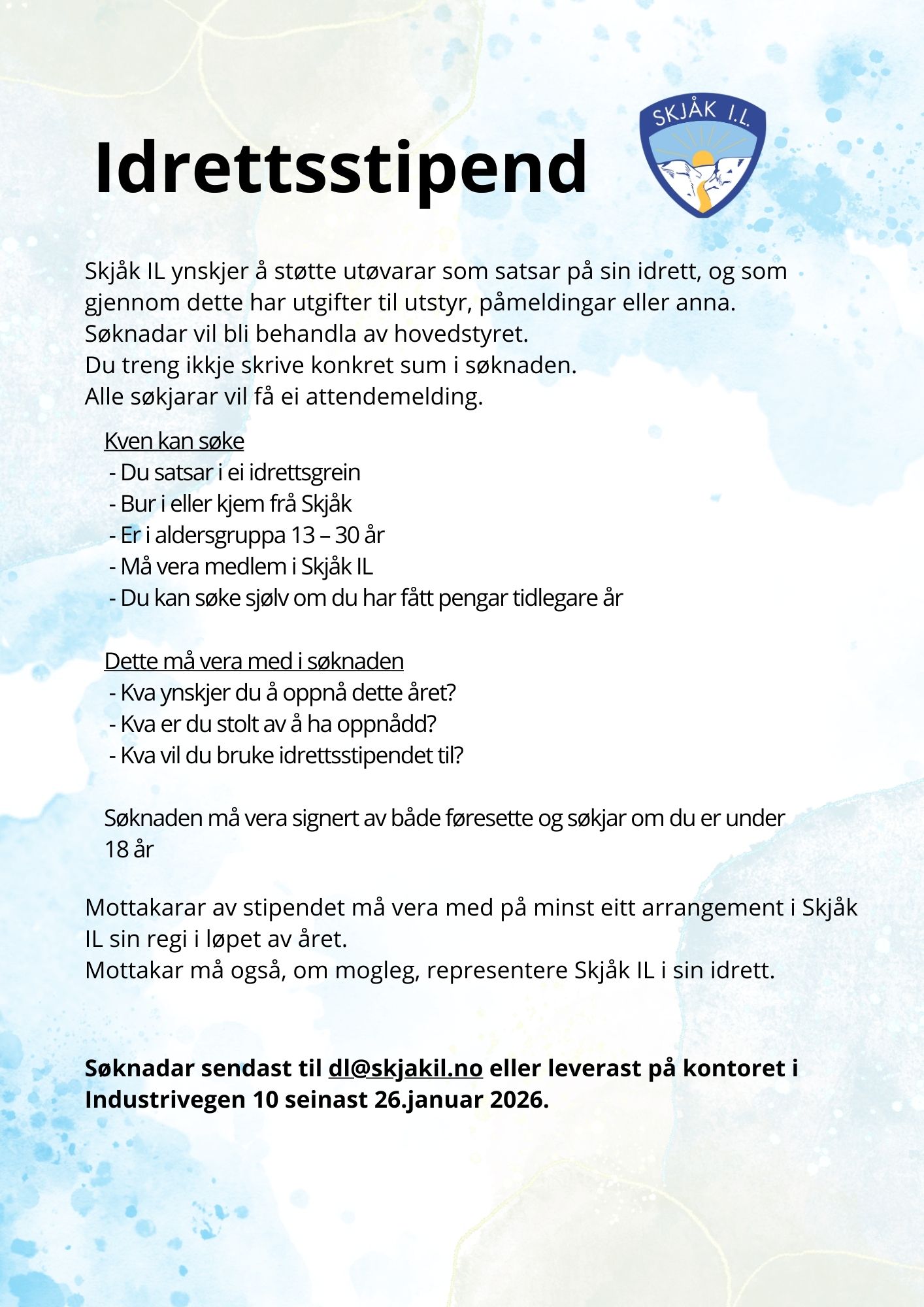 Skjåk IL ynskjer å støtte utøvarar som satsar på sin idrett, søknadsfrist 26.januar. Trykk her for full utlysning.